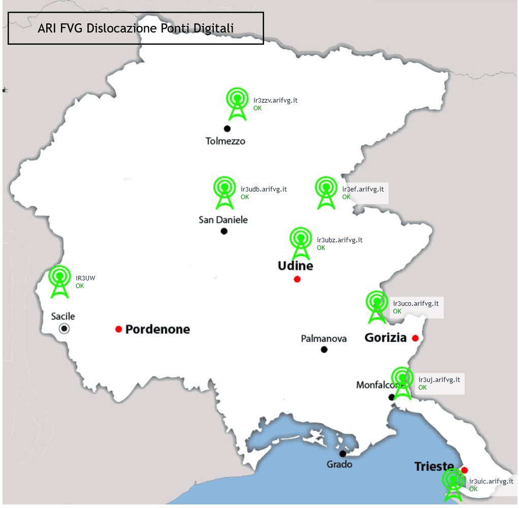 Posizione M.te Sabotino (GO) Udine città M.te Zoncolan (Ravascletto) (UD) Muggia Chiampore (TS) Monfalcone citta (GO) M.te Bernadia (UD) Cazzaso-Tolmezzo (UD) MHz San Daniele del Friuli (UD) M.te Lussari Tolmezzo (UD) Forcella Giais (PN) |